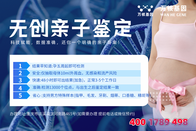 巫溪产前无创亲子鉴定办理地址:重庆市巫溪县滨河南路465号(如需要办理 提前电话或微信预约)-预约电话:4001789498,巫溪服务地区包括:万州区、涪陵区、渝中区、大渡口区、江北区、沙坪坝区、九龙坡区、南岸区、北碚区、綦江区、大足区、渝北区、巴南区、黔江区、长寿区、江津区、合川区、永川区、南川区、璧山区、铜梁区、潼南区、荣昌区、开州区、梁平区、武隆区、城口县、丰都县、垫江县、忠县、云阳县、奉节县、巫山县、巫溪县、石柱土家族自治县、秀山土家族苗族自治县、酉阳土家族苗族自治县、彭水苗族土家族自治县等周边城市,可在线咨询:产前无创亲子鉴定、司法亲子鉴定、移民亲子鉴定、入户亲子鉴定、中考亲子鉴定、高考亲子鉴定、个人隐私亲子鉴定等等咨询服务。